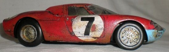 Then he remembered the museums recovery trailer, built some 10 years earlier, and thought how interesting it might look if it had a ‘barn find’ with it. So after a bit of thought, and tinkering about, this is what we now have. Initially intended to be the 1964 Riems 12hr winner driven by Graham Hill and Jo Bonnier, Ian decided to stay with that colour scheme and model the car as if were coming into the museum for restoration. No longer the competition winning master piece Ian had envisaged but at least he can still say he’s never thrown a model away.