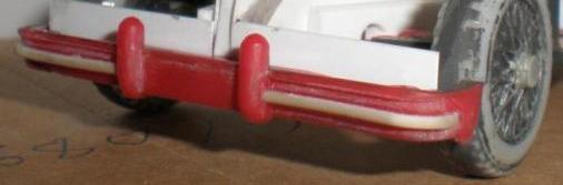 Further detail study prompted the addition of the other strengthening shape in the front bumper, this was done slowly by bending the closest size rod I had to fit the curve and then carefully gluing on with liquid glue. The problem is that bending rod at the same time as gluing often leads to the rod breaking in the middle of the bend, you have to make the shape first then fit it. Once the glue was properly set it was a simply sanding job to attain the desired shape.